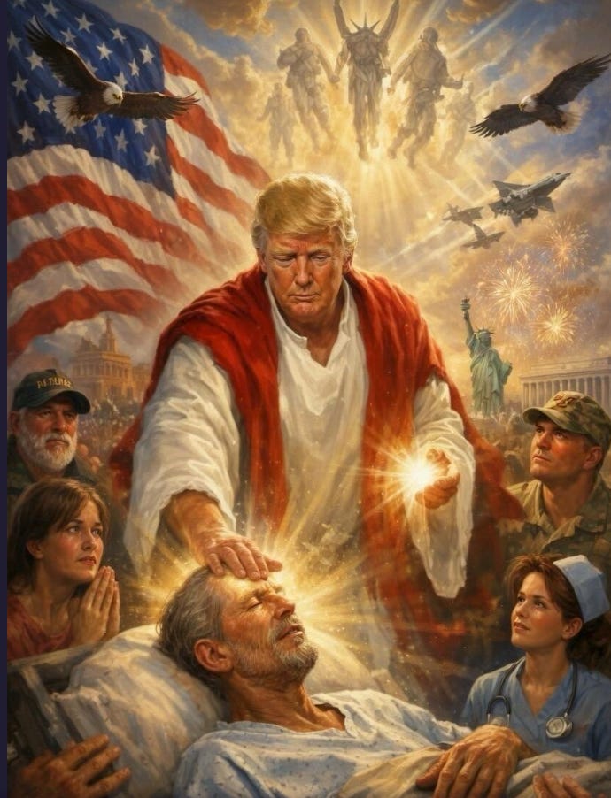 Yesterday, Trump posted an AI-generated picture of himself, looking like Jesus Christ healing a sick man (whom the internet agrees looks remarkably similar to Jeffrey Epstein). But this isn’t his first foray into the blasphemous, messianic rhetoric. Trump constantly uses language and images to elevate himself to a standing beyond the typical American citizen.